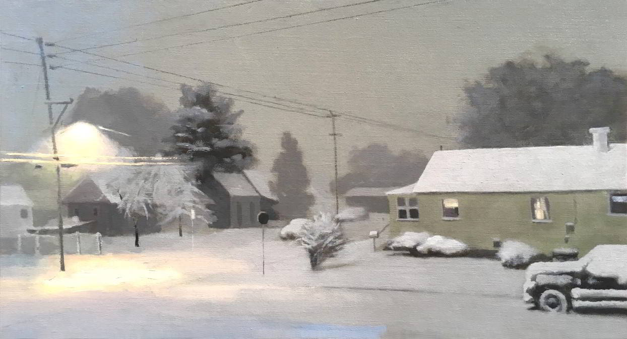 Donna’s House in the Snow – Early Evening, oil on canvas panel, 12 x 22, private collection