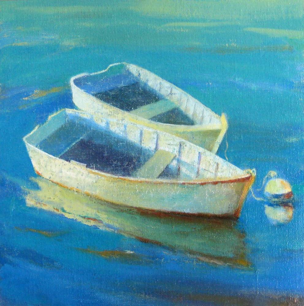 Dories at Mooring Buoy”, oil on linen panel, 12 x 12