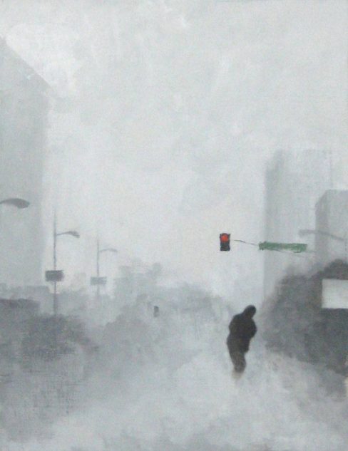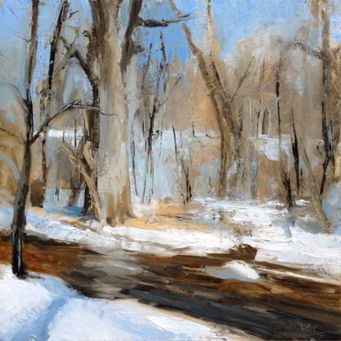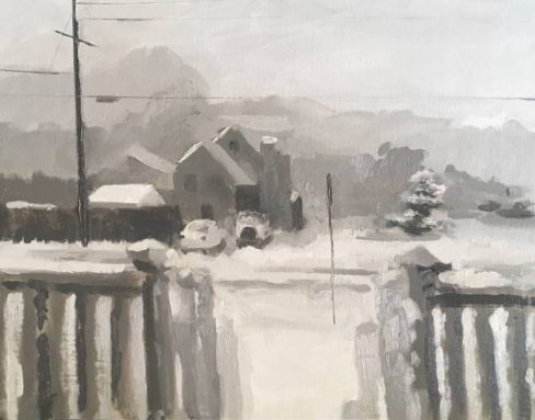 Snow Scene in a Beach Town”, oil on linen panel, 13 x 11, 2014 (private collection)